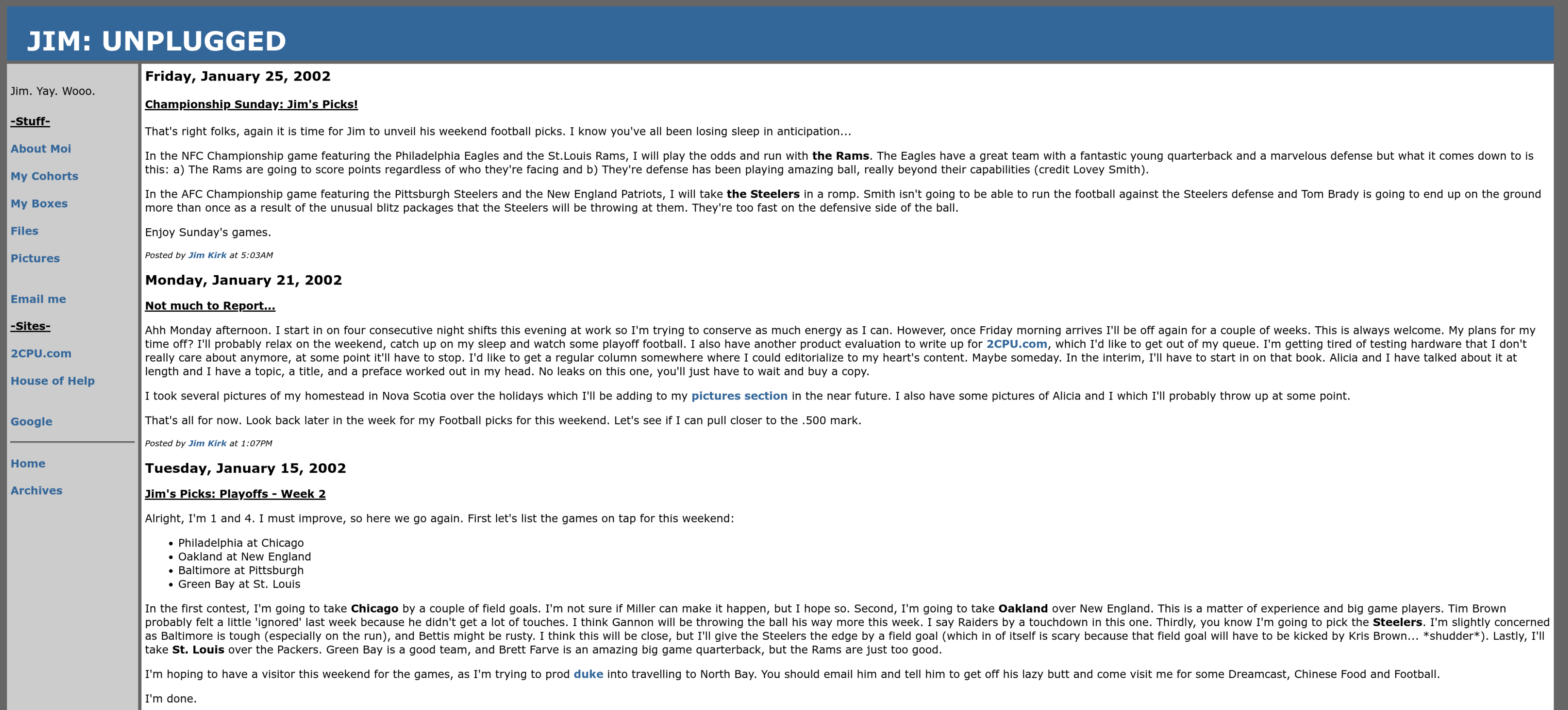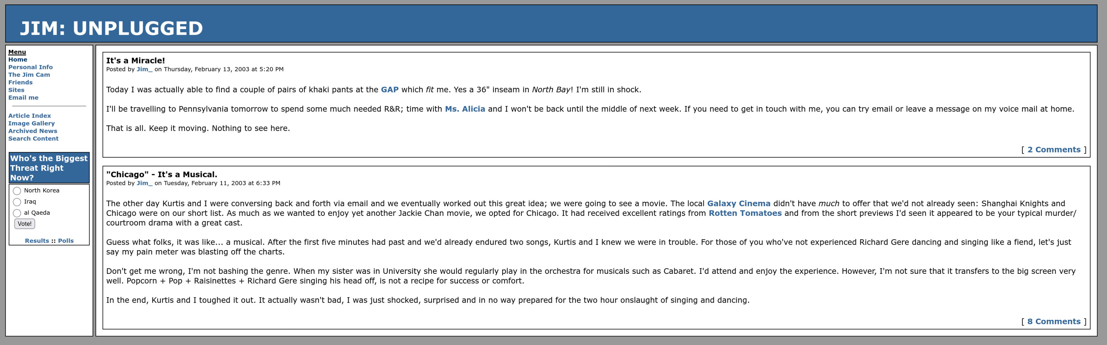 January, 2002 - “Jim: Unplugged” first emerges using an interesting table-driven design. Lots of blue and grey. Interesting.