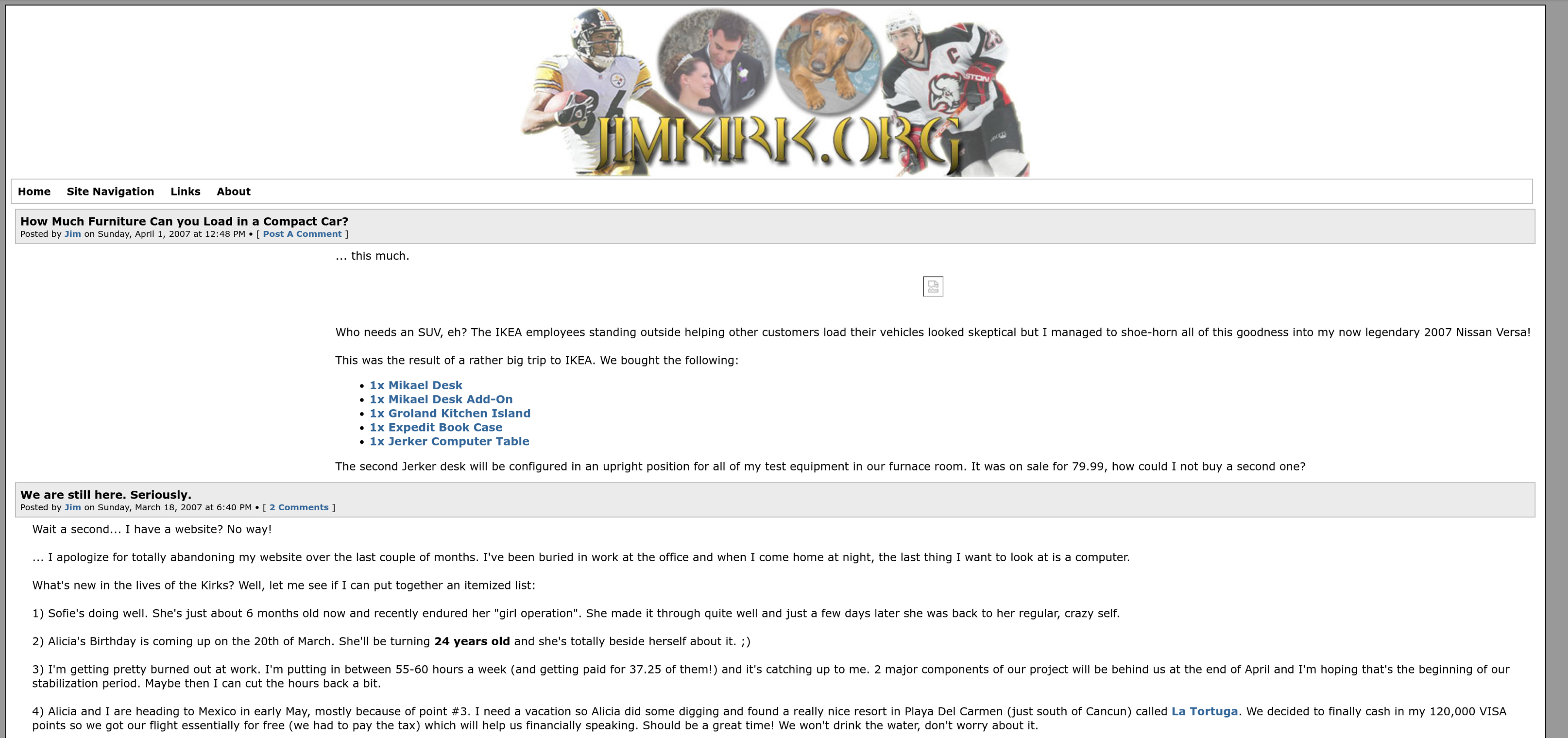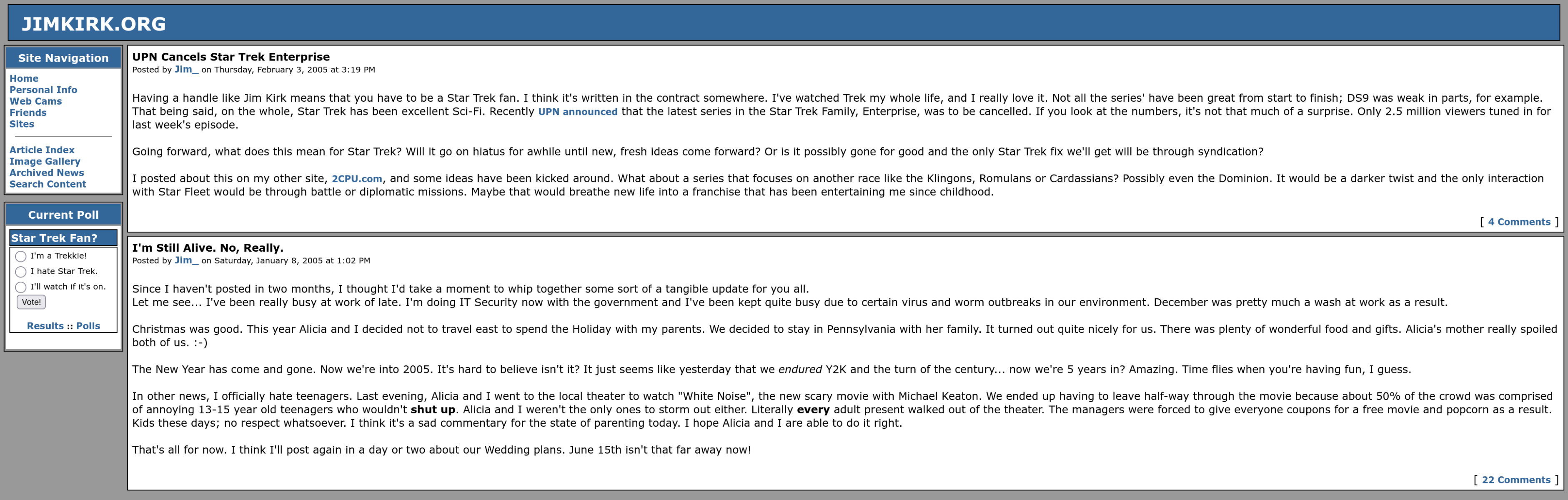 Have you ever heard of the “Way Back Machine”? It’s essentially an internet library… storing digital content found on the web. It’s intent is to ensure that possibly important content regarding our society isn’t lost when someone chooses to hit the ‘delete’ key. One of the interesting features is that you can plug in a web URL and ‘look back’ at not only the content previously stored there… but the web design itself. How about a glimpse into what was for jimkirk.org, shall we?